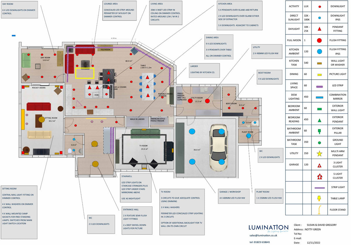 Presentation:A spreadsheet and annotated drawing summarizing lighting for each room and recommended fittings are presented.